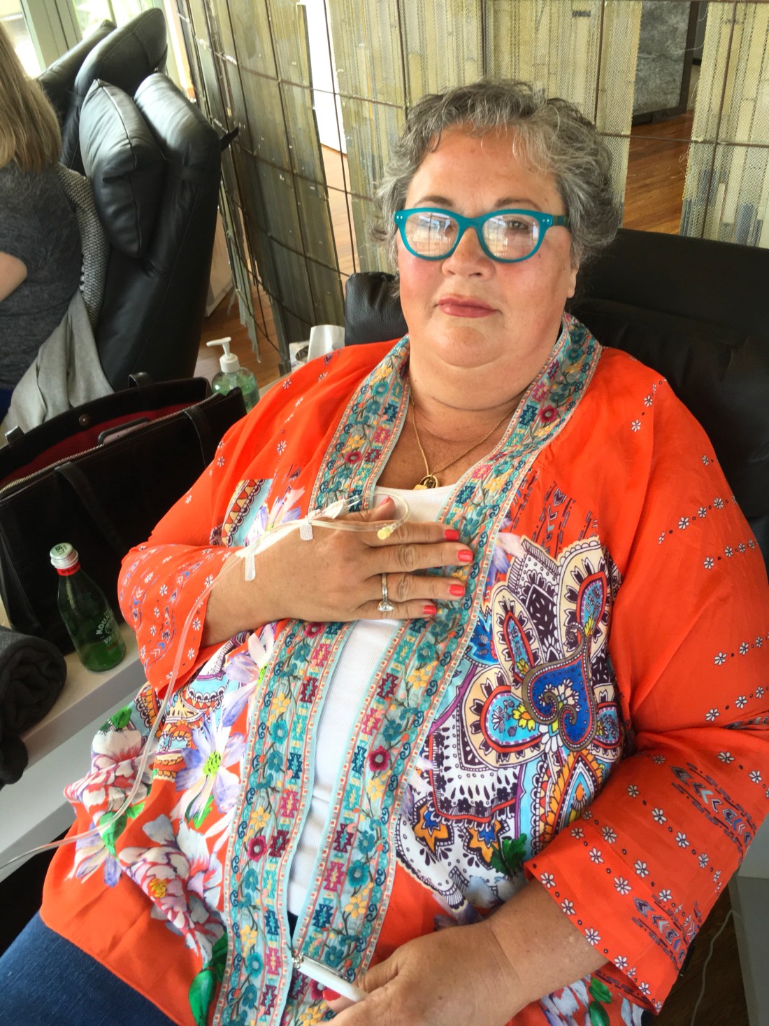 Got me on the third try today. Yaaaa! I’ll be here all day today. They’ve drawn 90 ml of blood and I’m waiting for it to be processed (2 1/2 hours), then they put in back through my IV and I’m good to go for the day! As you can see, I’m wearing my good luck charms….my Daddy Long’s wedding ring, my Aunt Jent’s crest ring and the panda my second husband gave me. Things are good!