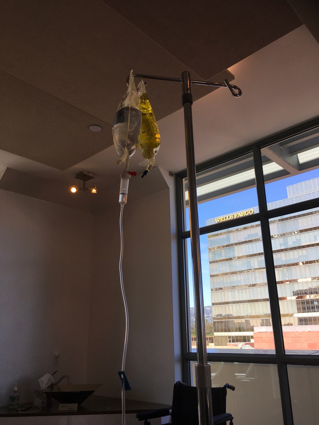Four sticks today but in a much better frame of mind. My last two IVs, saying sad goodbyes to some fine folks that know exactly what I’m going thru, and then home tomorrow!!! It’s strange how attached you get to people who are feeling your pain. I had one single mom who was in tears yesterday so H E and I put on the H E and Lil show and got her laughing. I’ll probably never be out here again but there are people here I will never forget!