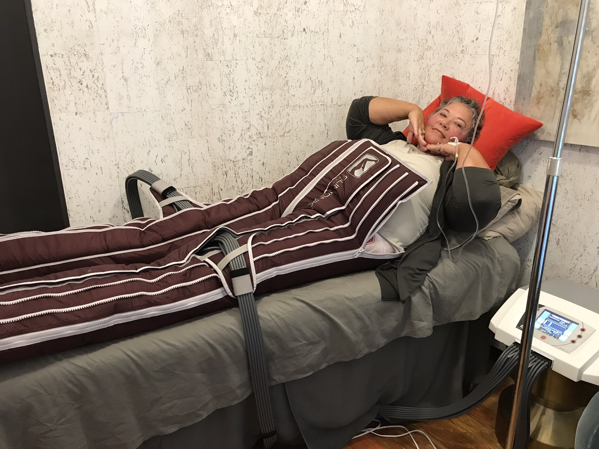 At this point I dropped it. The nurse said it was time for me to be put in the leg massage suit. The what??? It opens your lymphatic system so when I get my stem cells they flow better.